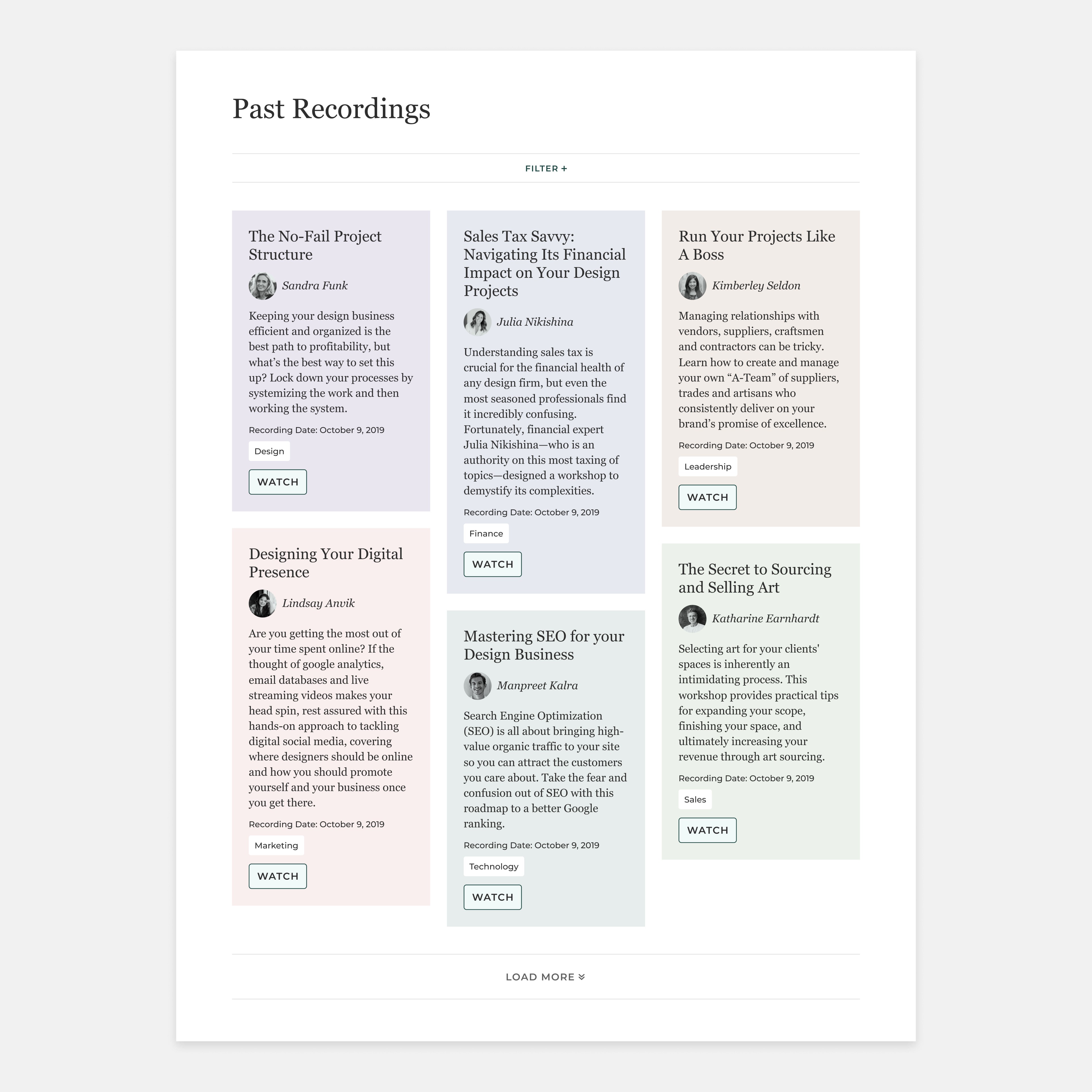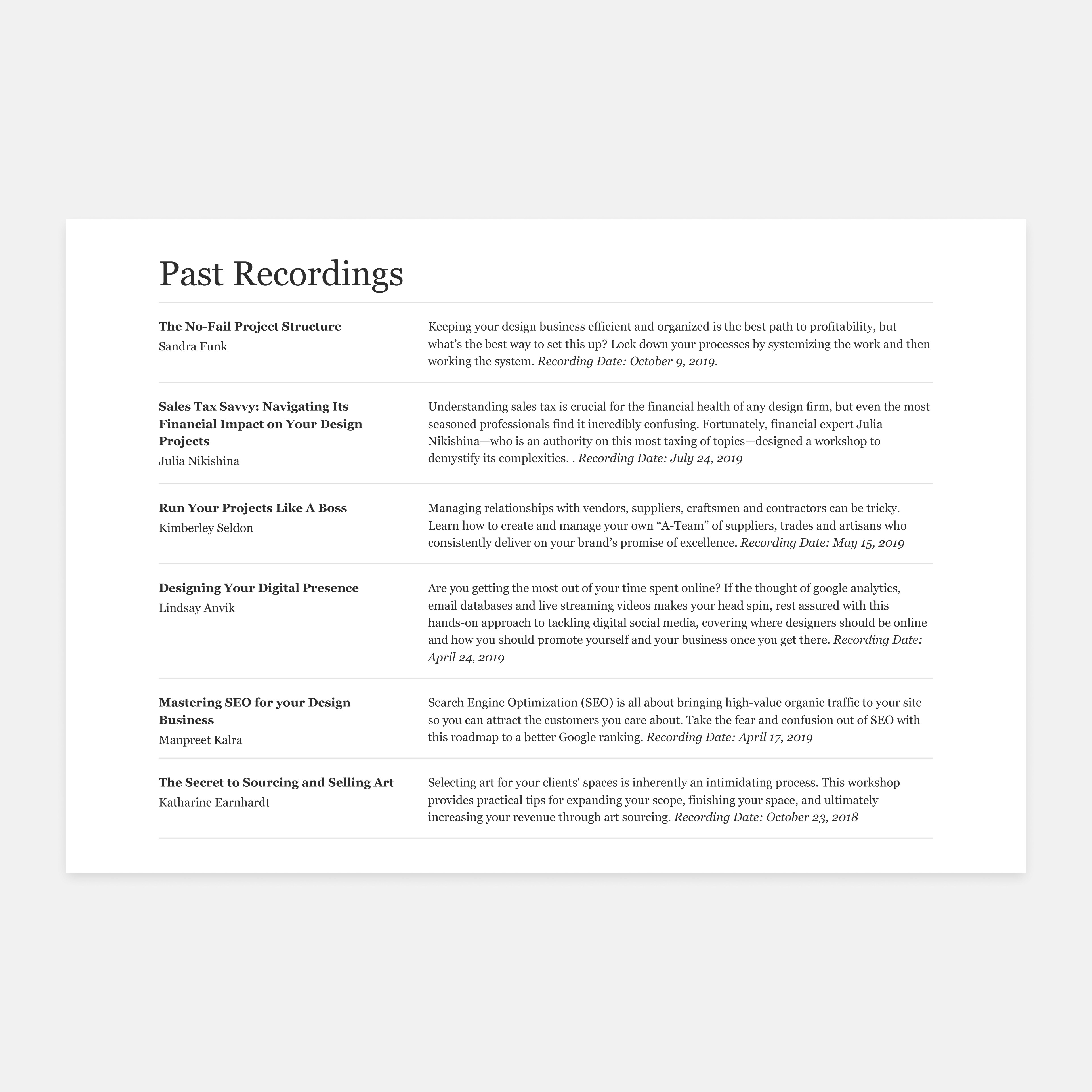 The recording section serves as an archive for past online workshops. Due to the lack of images, the original design is text-heavy, making it difficult to distinguish topics at a glance. This lack of visual appeal also reduces user engagement and fails to create an inviting experience.